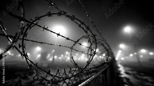 © dominic, Fototapeta premium Black and white photo of coiled barbed wire fence in foggy night with bright streetlights glowing through mist along empty road or pathway outside