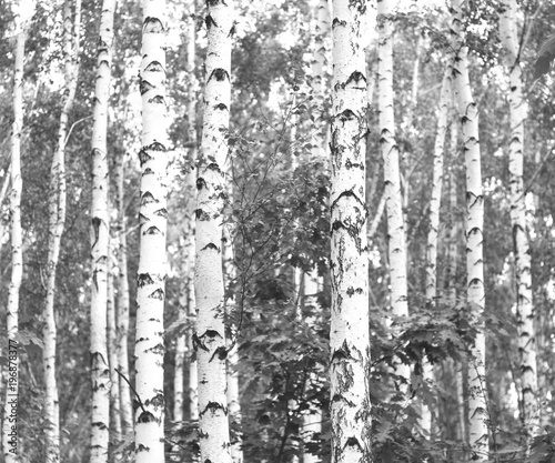 © yarbeer, Fototapeta premium Black-and-white photo of forest landscape with birches