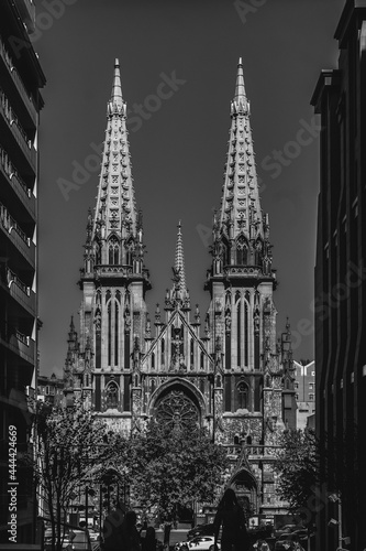 © mikus, Fototapeta premium Black and white photo of old catholic church. Cathedral in black and white colours in sunny day