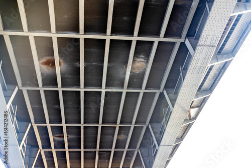 © Uladzislau, Obraz premium Black and white photo taken under the Manhattan Bridge overlooking the East River