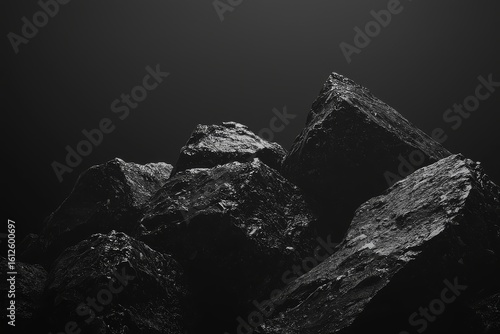 Naklejka premium Black-and-white photorealistic rocks with sea level in background, dramatic high contrast lighting and volumetric cinematic atmosphere, minimalistic dark style