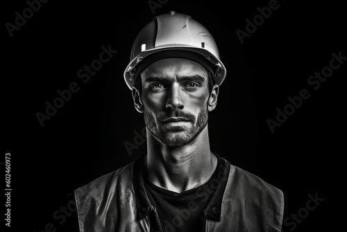 © JoelMasson, Fototapeta premium Black and white photorealistic studio portrait of a construction worker with hard hat on black background. Generative AI illustration