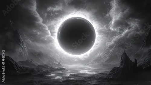 Fototapeta premium Black and white planetary eclipse over desolate fantasy landscape