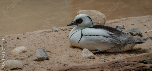 © dan, Fototapeta premium Black and White Plumage on a Smew Duck on a Sandy Beach