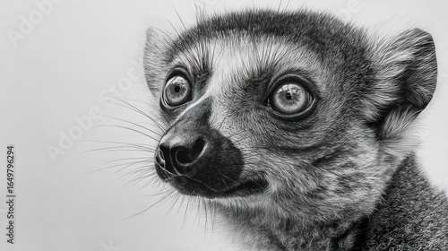 Fototapeta premium Black and white portrait of a lemur with large, expressive eyes looking upward to the right