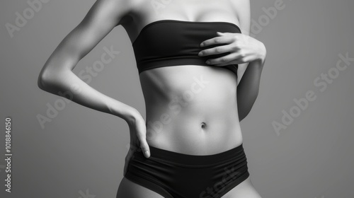 © Riko, Naklejka premium black and white portrait of a woman in sports bra showing torso. Studio fitness photography.