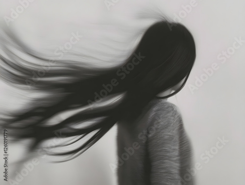 Naklejka premium Black and White Portrait of a Woman with Flowing Hair, Mystery and Motion