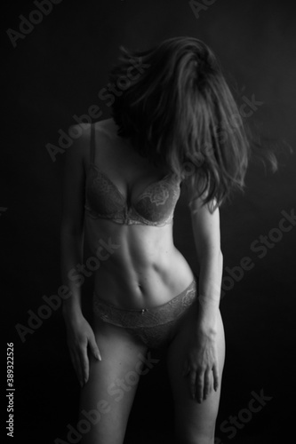 © Наташ Сергеева, Obraz premium black and white portrait of a young girl on a dark background in the Studio