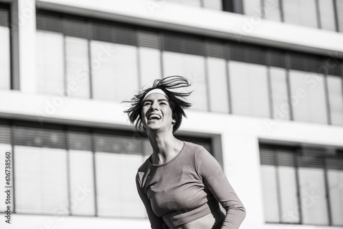 © Erika, Fototapeta premium Black and white portrait of a young happy woman with a wide smile on her face