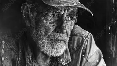 Fototapeta premium Black and white portrait of an elderly man wearing a cap, capturing the...