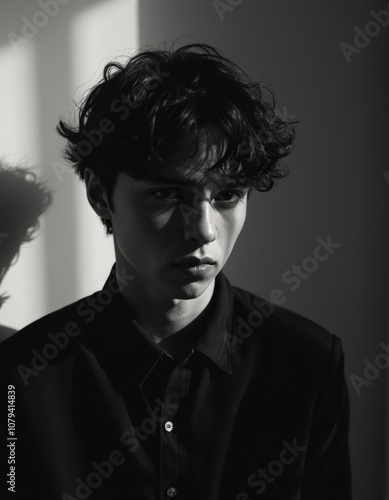 Obraz premium Black and White Portrait of Stylish Young Man with Dramatic Lighting