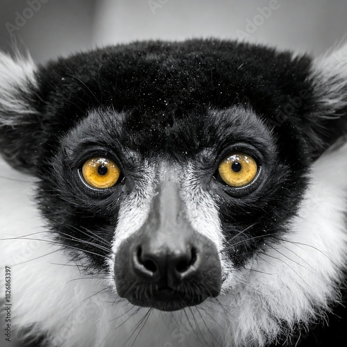 © Jeruk, Obraz premium Black and white primate, with striking yellow eyes, gazing intently