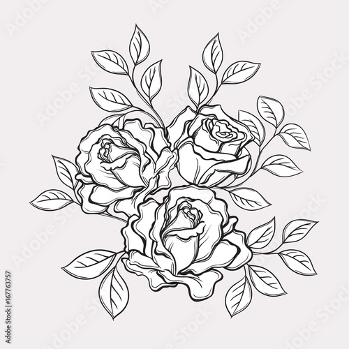 Fototapeta premium Black and white rose flowers and leaves. Hand drawn vector illustration....