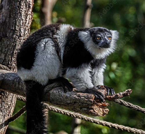 Obraz premium Black-and-white ruffed lemur on the tree. Latin name - Varecia variegata