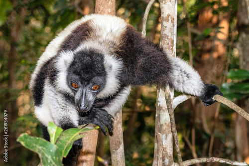 Fototapeta premium Black-and-white ruffed lemur, Varecia variegata, in its natural environment...