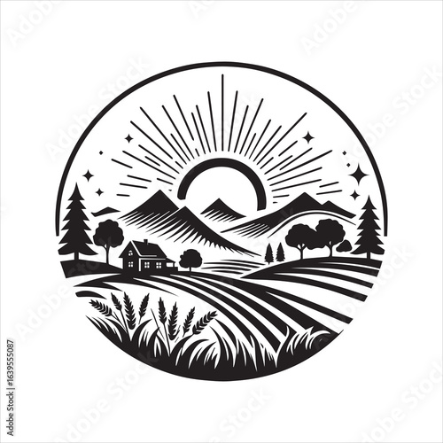 © Dani, Fototapeta premium Black and White Rural Landscape with Mountains Sunburst House and Wheat Field.