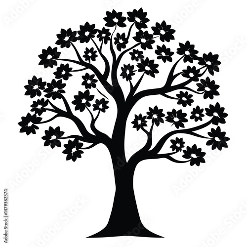 © Tanjila, Fototapeta premium Black and White Silhouette of a Blossoming Tree with Many Flowers