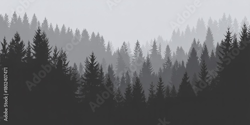 Obraz premium Black And White Silhouette Of A Dense Pine Forest With Layers Of Evergreen Trees Creating Depth And Foggy Atmosphere, Perfect For Environmental Or Design Backgrounds