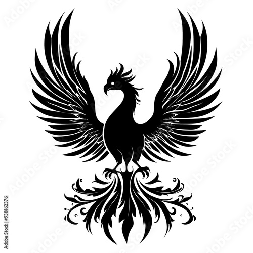 © Koborixgen, Obraz premium Black and white silhouette of a phoenix with outstretched wings.