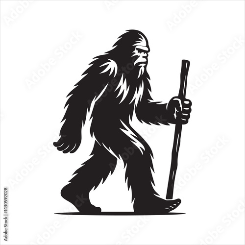 Obraz premium Black and white silhouette of a walking Yeti (Bigfoot) holding a walking...