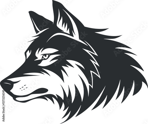 Naklejka premium Black and white silhouette of a wolf head, showcasing a fierce and majestic expression.
