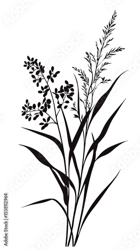 Fototapeta premium Black and white silhouette of grass and wild plants with slender leaves and seed clusters in minimalist flat vector style