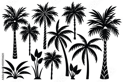 Fototapeta premium Black and white silhouette of palm trees and tropical plants set