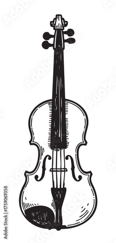 Naklejka premium Black and white sketch of a classical violin with detailed strings and body, featuring f-holes and tuning pegs.