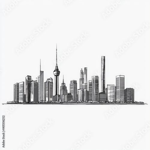 © Pornnapha, Naklejka premium Black and White Sketch of Modern City Skyline with Distinctive Landmarks and Tall Buildings for Artistic Design Projects