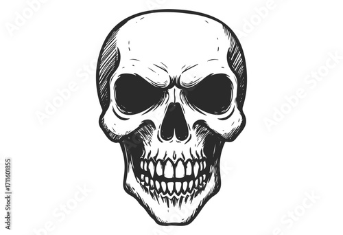 Fototapeta premium Black and white skull illustration with intense expression and detailed lines...