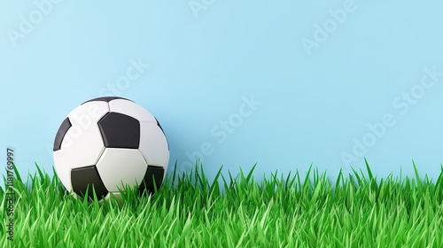 Obraz premium Black and White Soccer Ball on Green Grass with Blue Background