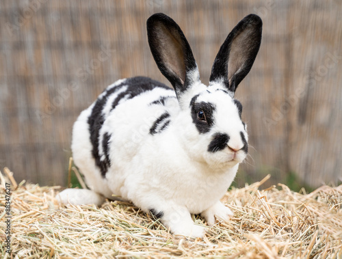 © smilewalli, Fototapeta premium Black and white spotted rex rabbit sits on dry grass on a sunny day before Easter