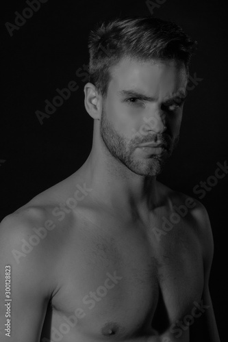 Naklejka premium Black and White Strong stripped muscle male model in black underwear on black...
