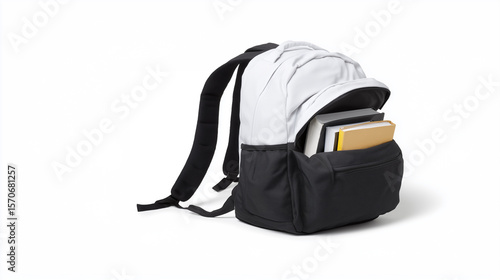 © Debi Kurnia Putra, Naklejka premium Black and white student backpack filled with books and school supplies