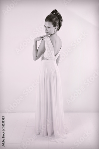 © likstudio, Fototapeta premium Black And White Studio Shot Of Sensual Elegant Woman With Classic Hairstyle Posing In Beautiful White Dress