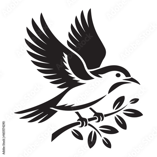 Fototapeta premium Black and white stylized bird in flight on a branch