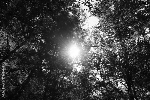 © ShakedN, Naklejka premium Black and white sun rays shining through the tops of trees (Canopy)