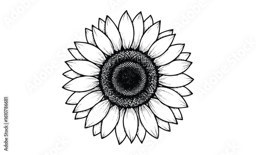 Fototapeta premium Black and white sunflower drawing with detailed petals and center. Vector...
