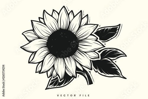 Fototapeta premium Black and White Sunflower Floral Vector Illustration with Petals and Leaves, Featuring a Decorative Spring and Summer Design