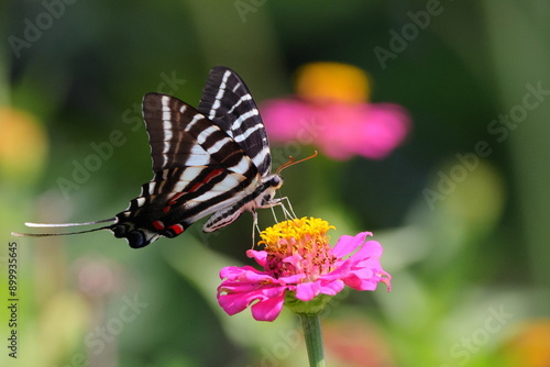 © Mark, Fototapeta premium Black and white swallow-tailed butterfly on pink zinnia flower.