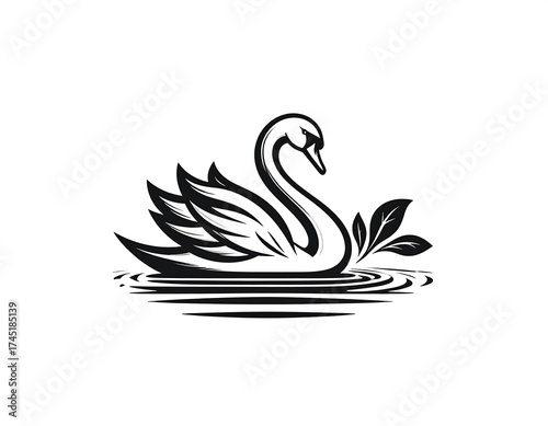 Fototapeta premium Black and white swan graphic design. Swan gracefully gliding on water, stylized with foliage. Elegant, vintage-inspired