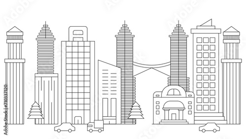 Obraz premium Black and white vector city building line art vector icon design illustration template background City landscape line urban skyline with cloud, building, cityscape hand sketch, flat houses