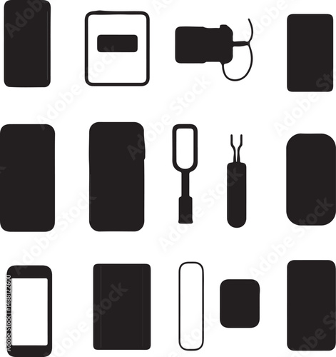 © Parvin, Fototapeta premium Black and White Vector Icons: Smartphone, Tablet, Camera, and SIM Card Tools - Minimalist Silhouette Graphics Set for Tech Design