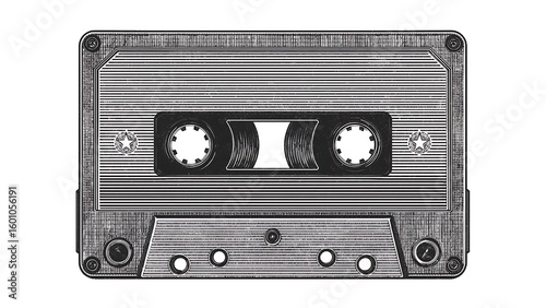 © Fairy Art, Fototapeta premium Black and white vector illustration of a cassette tape. Classic and timeless charm. On a white background.