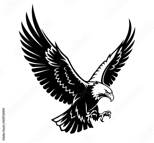Obraz premium Black and white vector illustration of a powerful eagle in mid-flight.