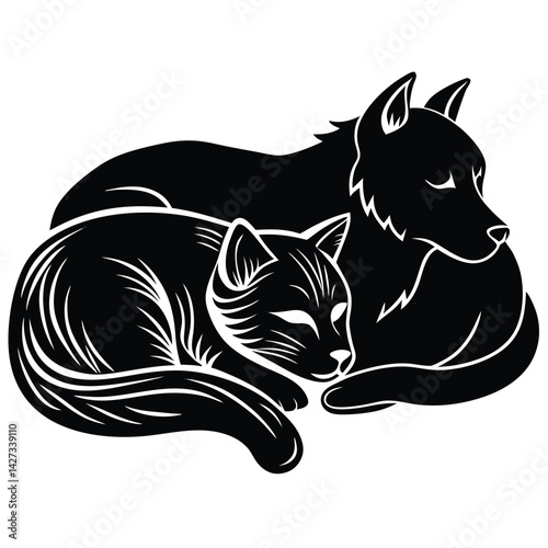 © SilhouetteStore, Obraz premium Black and White Vector Illustration of a Sleeping Cat and Dog, Cute Pet Animals, Friendship Concept, Minimalist Design