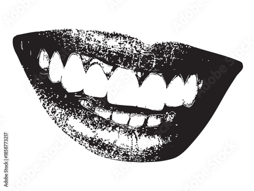 © Simiya, Naklejka premium Black and white vector illustration of a smiling mouth with teeth and lips