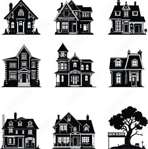 © ahmadkhanartworks, Fototapeta premium Black-and-White Vector Illustration of House Styles Grid – 9-Item Architectural Silhouette Set