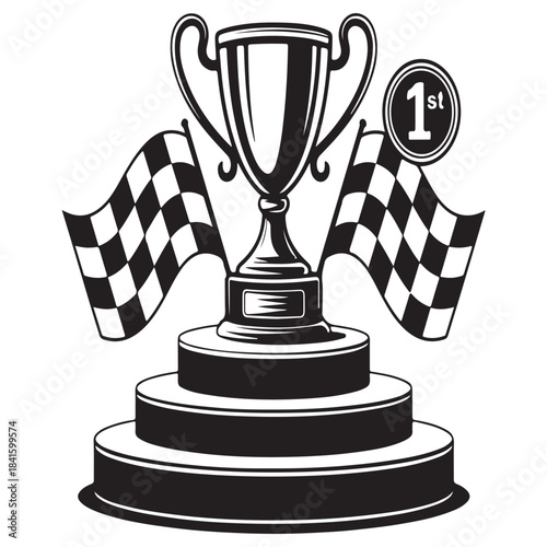 © samim, Fototapeta premium "Black and White Vector Illustration of 1st Place Racing Trophy with Checkered Flags on Podium"