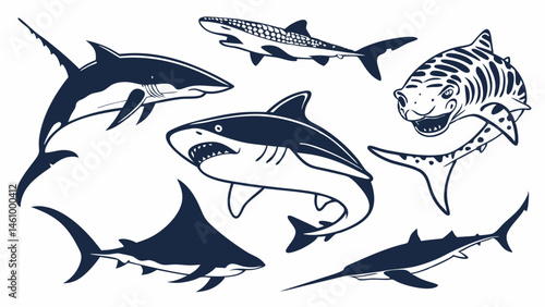 Fototapeta premium Black and White Vector Illustration Set Featuring Diverse Shark Species Like...